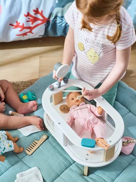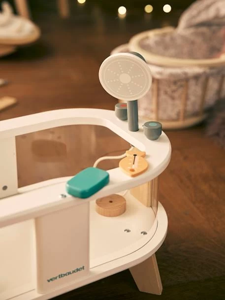 Plouf, c’est l’heure du bain ! Grâce à cette jolie baignoire en bois et plexiglas, les enfants vont pouvoir s’amuser à laver leur poupée. Des boutons « chaud », « froid » à tourner, un pommeau de douche, un savon et un thermomètre poisson… tous les éléments sont réunis pour imiter avec beaucoup de réalité ce moment tant apprécié des enfants.