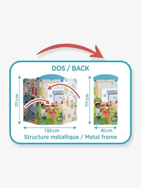 - De nombreuses fonctions liées à l’univers de la médecine sont reprises : coin radiologie, reconnaissance des parties du corps, partie nutrition, échelle optométrique, horloge des bobos, échelle de croissance, toise avec équerre jusqu’à 1m20, pèse-personne factice, horloge expliquant le déroulement d’une consultation, et bien d’autres encore…