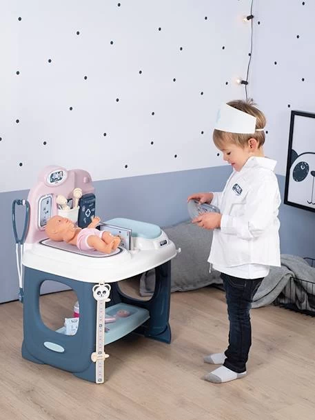 Avec le centre Baby Care, votre enfant endosse le rôle de médecin pour s’adonner durant des heures à examiner, peser, mesurer, vacciner et prendre soin de son poupon. Tout y est pensé pour que l’enfant retrouve l’univers du cabinet pédiatrique : le stéthoscope, le test de vision, l’appareil pour écouter les battements du cœur… et même une tablette électronique amovible avec LED et sons qui se déclenchent aléatoirement pour indiquer à l’enfant ce qui ne va pas et ce qu’il faut faire.