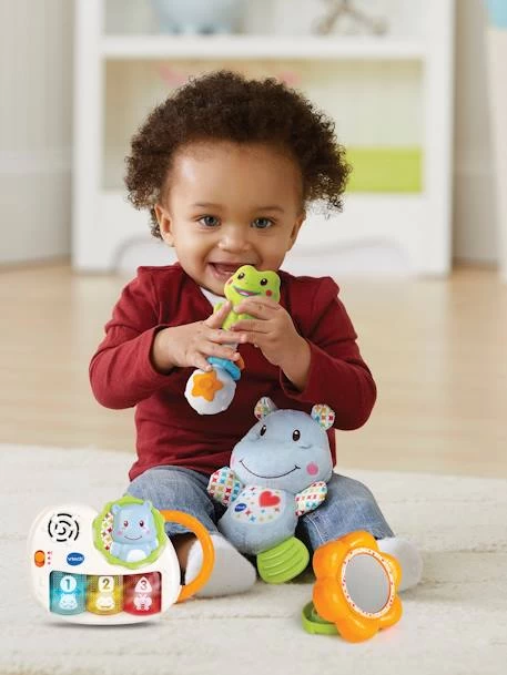 – d’un hippo en peluche tout doux avec différentes textures et des pattes en plastique souple pour apaiser les poussées dentaires de bébé