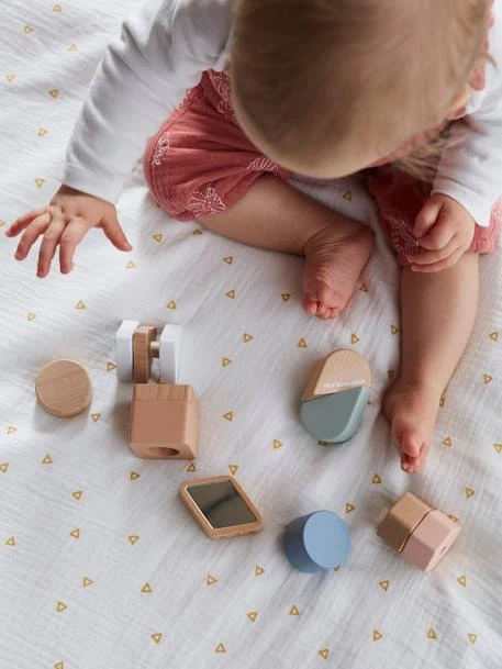 - 6 formes : 1 -Triangle qui claque, 2 – Cube kaléidoscope, 3 – Cylindre à visser, 4 – Hexagone clic-clic, 5 – Oblong : se transforme en coeur quand on tourne les pièces et 6 – Losange en feutrine et miroir