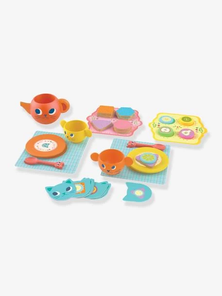 - Contenu : 35 pièces : 4 sets de table, 2 tasses, 1 théière, 2 petites cuillères, 2 assiettes en bois, 8 biscuits illustrés, 8 pièces de feutrine, 8 cartes modèles « chat ».