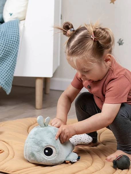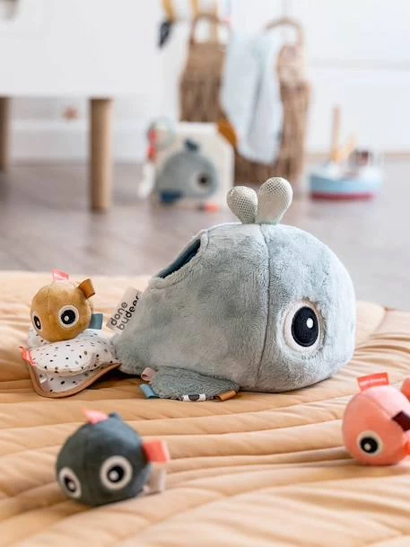 Craquez pour cette adorable baleine Wally, accompagnée de ses petits amis poissons ! La joyeuse baleine aime jouer à cache-cache. Découvrez comment les petits poissons se cachent à l’intérieur de Wally. Chaque poisson émet un son différent : une clochette, un bruit de papier et un carillon encourageront les petits à ramper derrière eux. Laissez votre petit bout découvrir les petits poissons, les différentes textures de la baleine ainsi que le miroir caché sur sa nageoire. Les étiquettes colorées et le jet d’eau seront également de belles surprises ! Ce jouet d’éveil va bien amuser les petits tout en développant leur concentration et leur coordination œil-main.