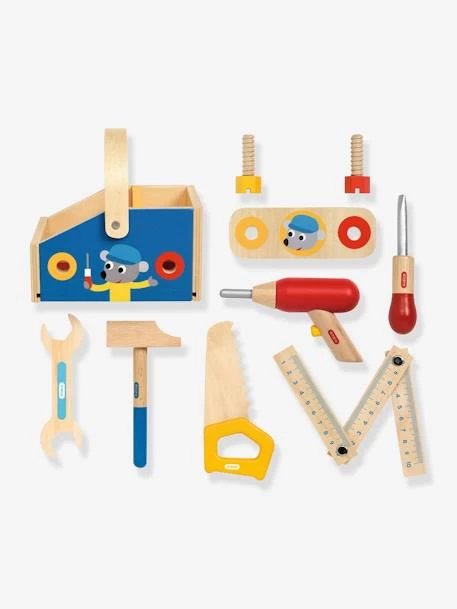 - Contenu : 6 outils (1 perceuse, 1 tournevis, 1 clef à molette, 1 scie, 1 marteau, 1 mètre qui s’articule), 1 boite à outils avec 2 compartiments et 1 solide poignée, 1 pièce en bois trouée, 2 grosses vis.