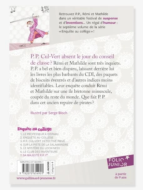 P. P. Cul-Vert absent le jour du conseil de classe ? Rémi et Mathilde sont très inquiets. P. P. a bel et bien disparu, laissant derrière lui les livres les plus barbants du CDI, des paquets de biscuits éventrés et d’autres indices moins identifiables. Leur enquête conduit Rémi et Mathilde sur une île bretonne minuscule, coupée du reste du monde. Que fait P. P. dans cet ancien repaire de pirates?