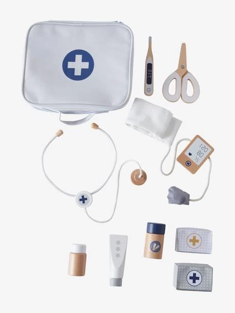 - Contient : 1 mallette en tissu, crèmes, coton tiges, thermomètre, tensiomètre, stéthoscope, bandage, pansements, ciseaux.