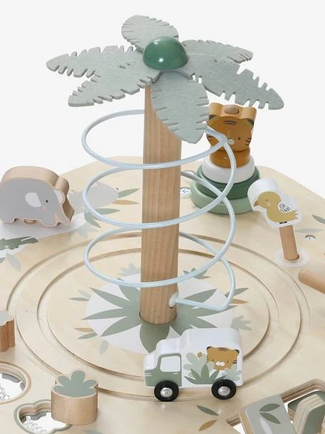 - Palmier boulier et toboggan à balle, camion de safari qui tourne autour du palmier, encastrement avec des formes ou la boule à marteler, éléphant à visser, pyramide tigre, perroquet à faire voler avec l’oiseau marteau, rangement pour la boule ou le marteau, méli-mélo des félins, buisson