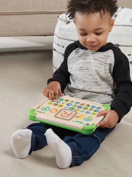 Bébé part à la découverte de la nature avec sa tablette éducative ABC nature de VTech. Cette tablette en bois est conçue pour être résistante à toutes les manipulations de bébé et des bords antichocs ont même été intégrés ! Grâce aux 240 chansons, mélodies, sons et phrases, bébé va s’éduquer sur de nombreux sujets autour de la nature. 26 touches tactiles permettent de découvrir les lettres de l’alphabet et leur son. En appuyant sur chaque touche, Bébé voit la lettre correspondante s’afficher sur l’écran LED tactile ! Une jolie façon d’apprendre tout en s’amusant !