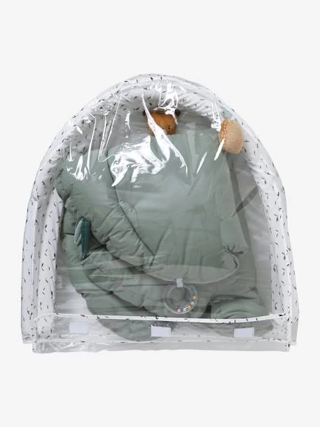 - Jouets sur le tapis : 1 éléphant en velours avec boîte à musique, 1 anneau de dentition, 1 miroir, 1 anneau à billes, des rubans et 2 feuilles en coton